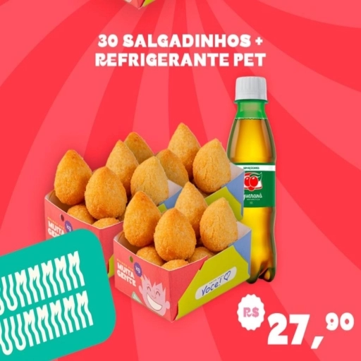 30 salgados + 20 bombinhas de churros + 2 refrigerante pet